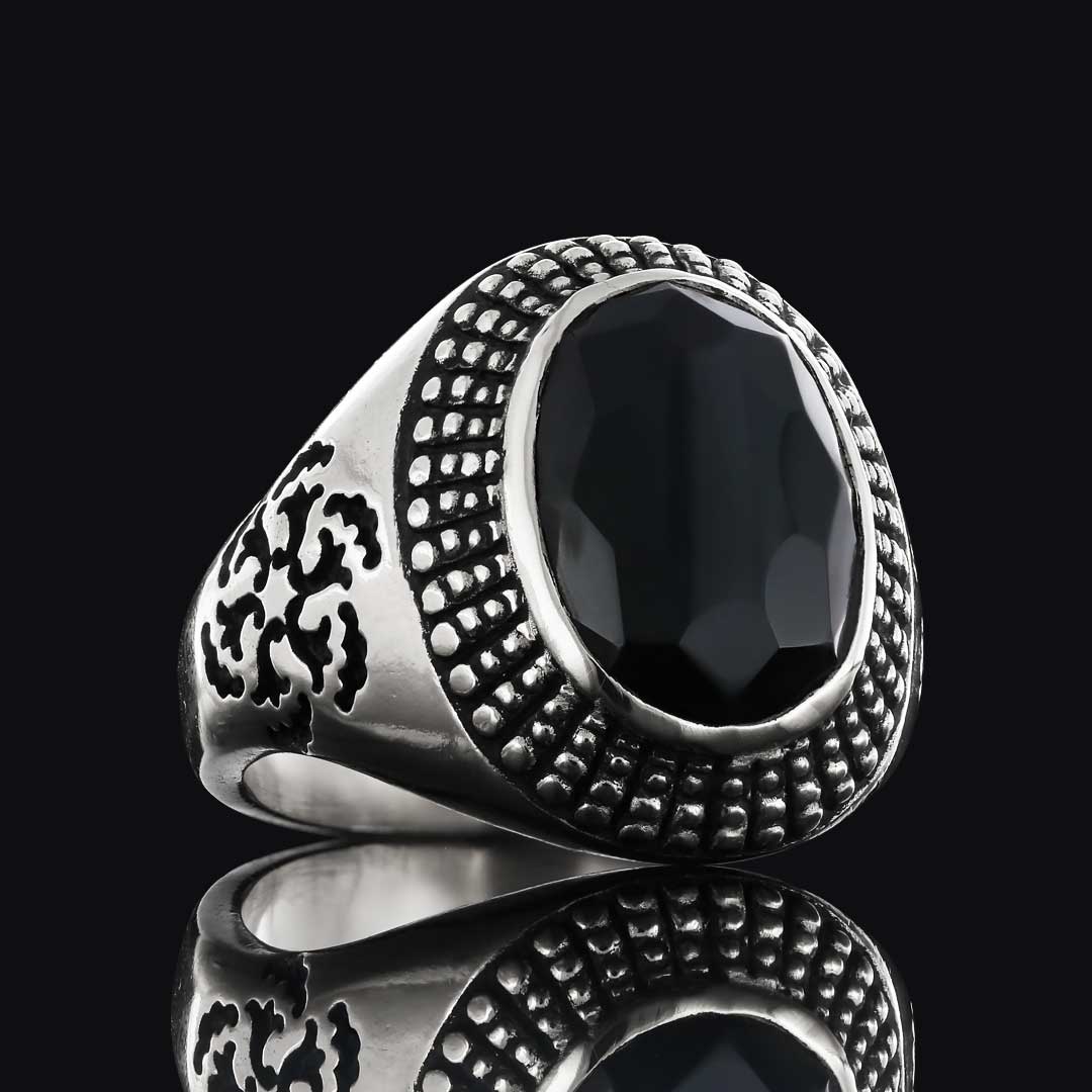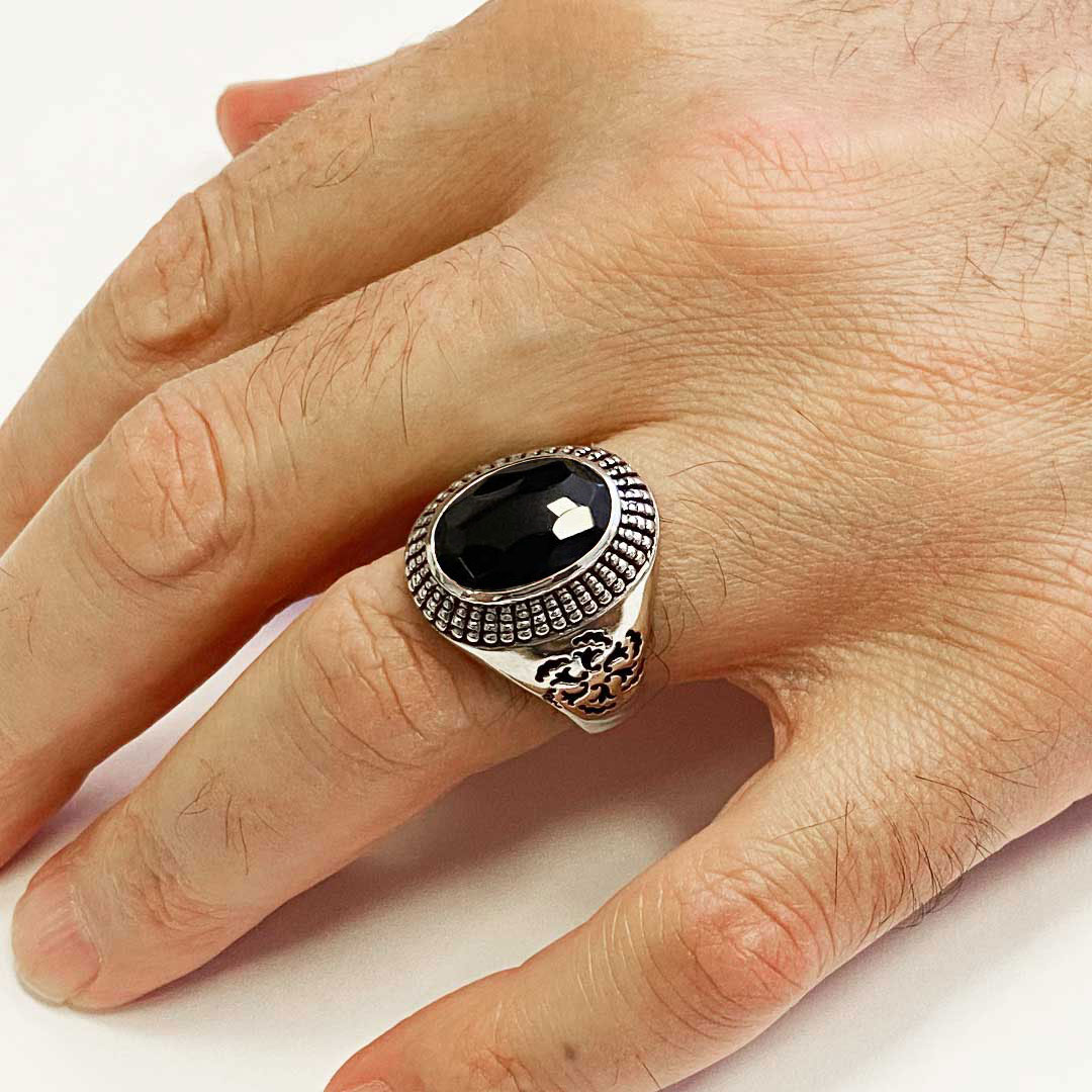 Motifli Oniks Taşlı 925 Ayar Gümüş Erkek Yüzük, Oniks Yüzük, Siyah Akik Yüzük